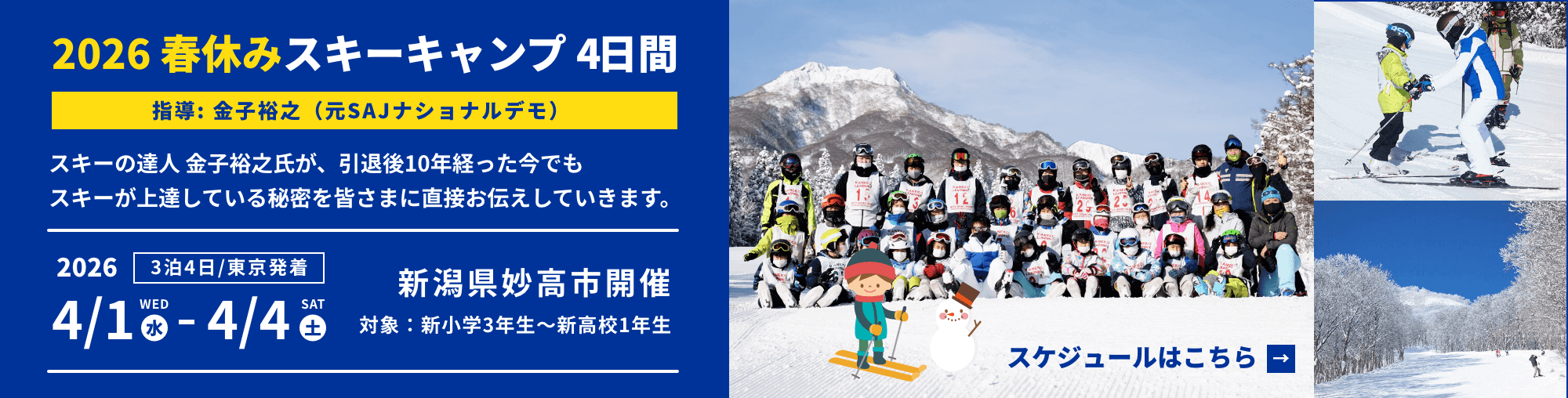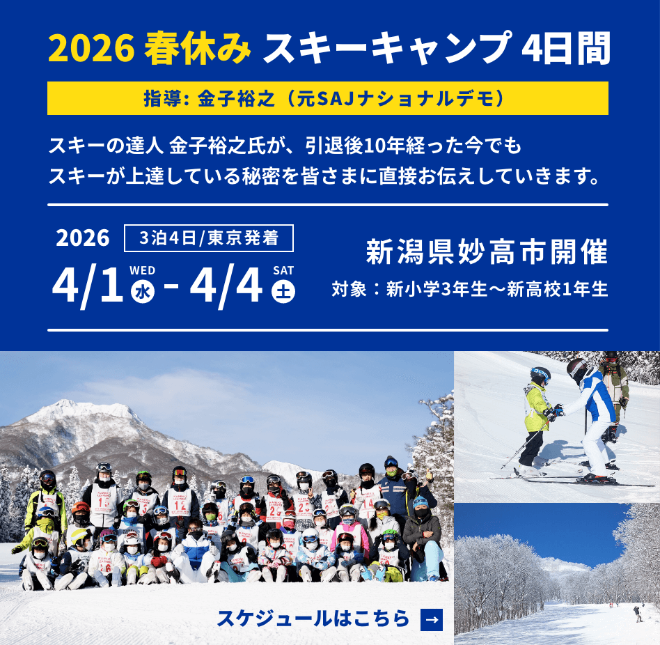 金子裕之氏(元SAJナショナルデモ)が、46才まで全日本のトップスキーヤーとして活躍し、引退後10年以上経ったいまでもスキーが上達している秘密を、はじめてスキーを履く初心者のお子さんからSAJ1級を目指している上級者のお子さんまで、一人一人にお伝えしていきます。